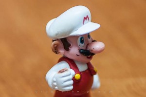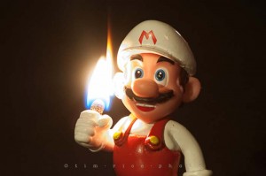 I have a journal (virtual journal on my iPad – app is called paper, very cool) and in it are ideas for photos. I keep putting them in, but this is the first one I have actually shot. I would like to say ‘no Marios were hurt in this shot’, but I can’t. I only had a couple chances to get it right before he melted away. First I tested the exposure for Mario, next I shot it with a match lit next to him to adjust for the flame. Once I had the exposure set, I drilled a hole in his fist snipped a few match heads put them in his hand and took three shots. The first one lit his ear and the side of his head on fire. The second one the head of the match was too big and the flame went out of the top of the frame. The third one I was able to get what I wanted. I would have rather his hand have been flat but this is what I had to work with. There is no Photoshopping in this photo, simply some vignetting to make the edges darker, and some minor spot removal to cosmetically hide some burn marks. Check out the scars and one of the other shots below – notice the burning ear.