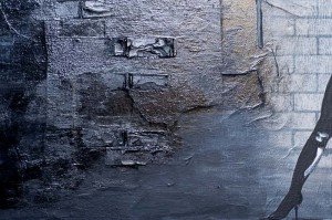 I asked her for some info about this piece… this is turning into an interview, that was not the intent, though wouldn’t it be cool if I had a clip to show? Just so I could say, roll the clip. Anyway, this is what she wrote back:  “I slapped plaster on canvas, sanding and carving cracks into it. Then painted the entire thing with black acrylic. I sketched on, ripped up, and glaze layered transparency paper. Then, again layering and building out the bricks with plaster. Then more acrylic. I also used a glazing medium for the first time which helped me blend the highlights and shadow. Finally I decided I needed a visual source of light. Something dank, dirty, back alley, Tim Burton kinda stuff. Strangely, this idea came to me by way of bare feet and my son’s discarded laser pointer caps, (which he so kindly displayed for me on the floor) I used the metal cap and some jewelry wire as the base and sculpted the wall lamp out of polymer clay. afterwards I used metallic paints to finish the piece.”