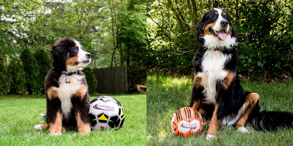 My friends at Long Distance Tire in Medway dropped off a brand new soccer ball for Joise today. New design, so we had to update the photo from last year – the last one was 1year/10days and about 65lbs ago. This time was a but more difficult, she just wanted to play… she was kind of distracted. She tore into it right after the shoot. Thanks to LTD, Josie is a huge fan.