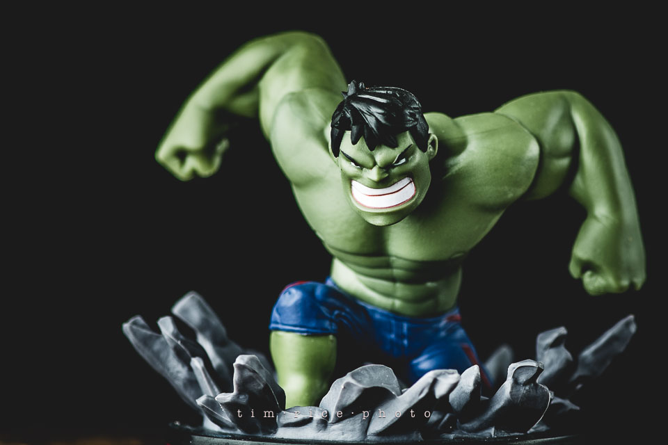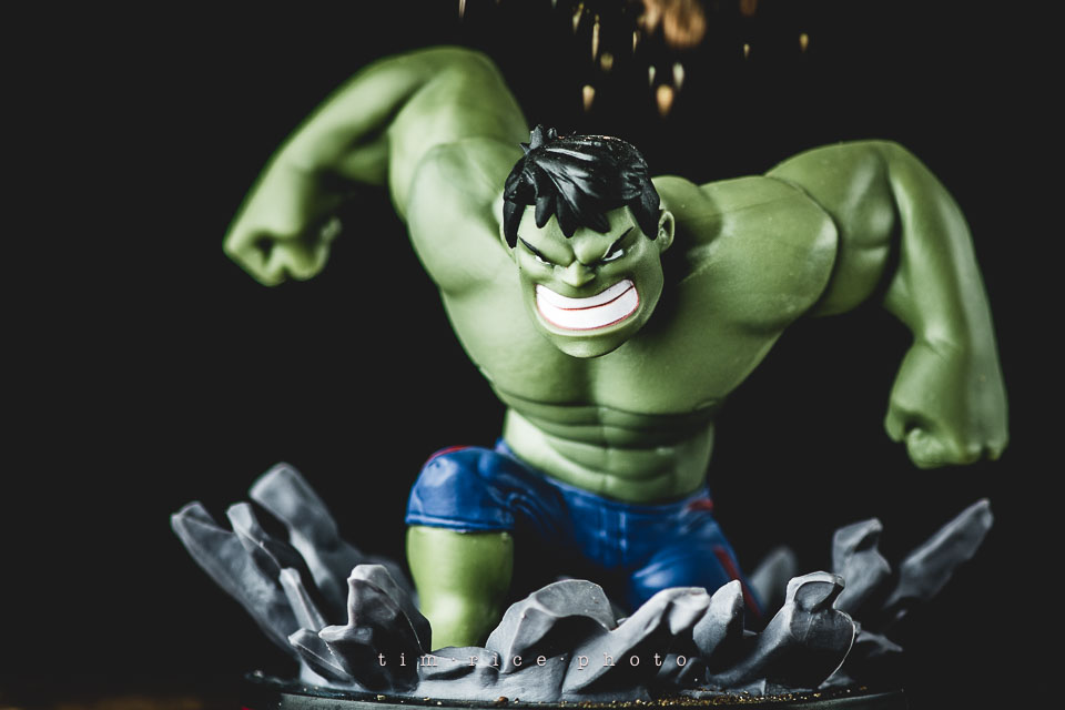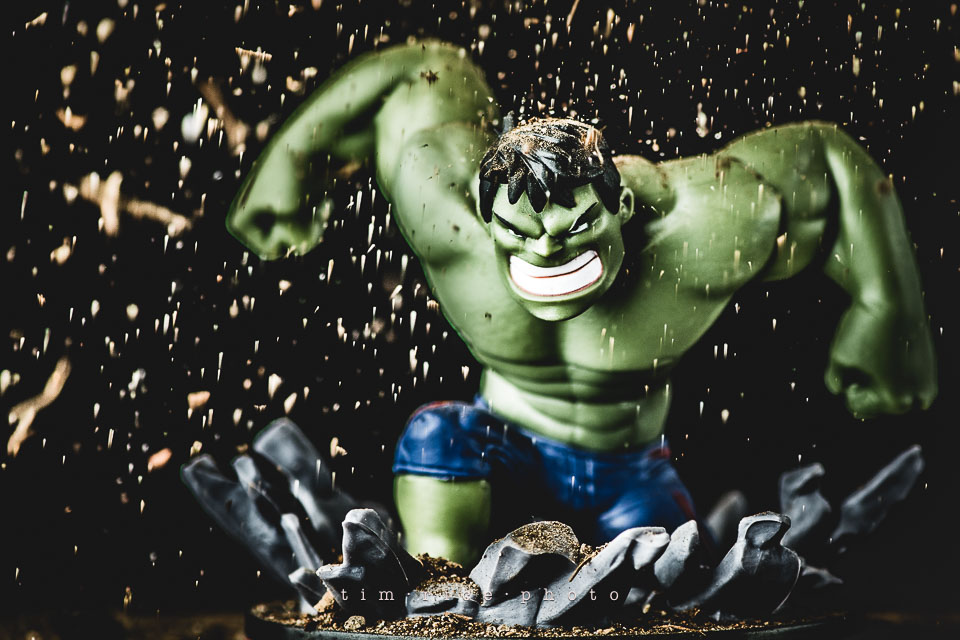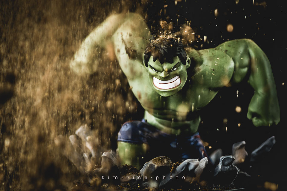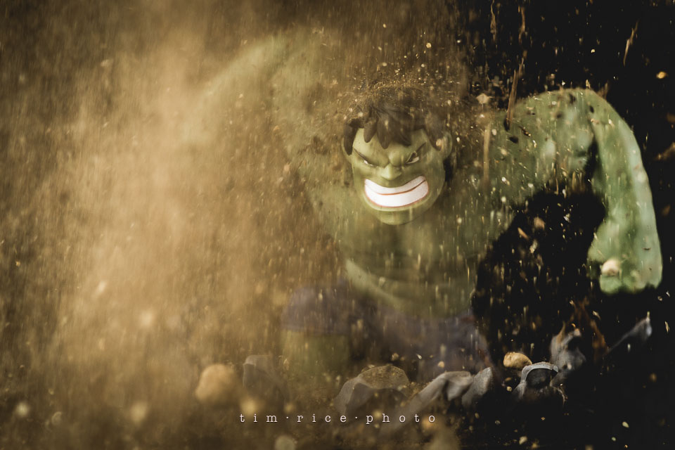 I have been uninspired to shoot toy photos lately. Subjects go in cycles. The last few weren’t interesting to me, plain. Sitting at the studio tonight, this Hulk has been on the shelf waiting his turn, and it hit me… dirt. This is not photo-shopped, I am sure it could had been, but I rather shoot it in the camera. A handful of dirt, one light and reflector and 5 shots, 4 attempts and a vacuum to clean it all up. The progress is shown below. My favorite is above.