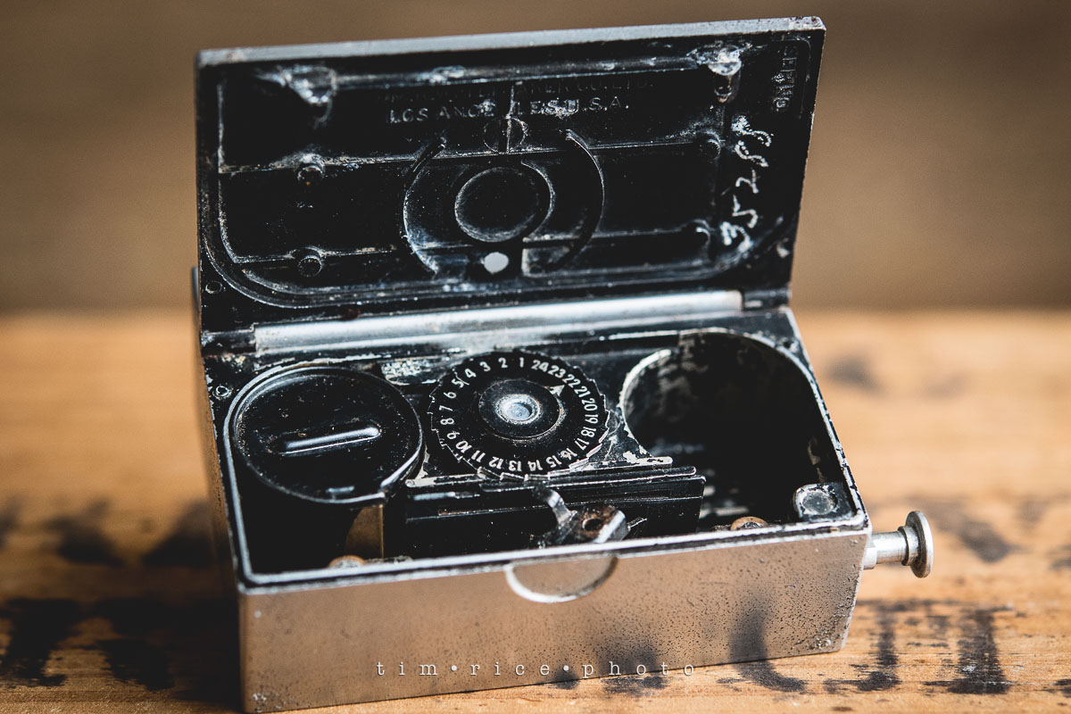 I picked this up at Brimfield yesterday, a Whittaker Micro 16 camera, a spy camera. A little bit bigger and a lot heavier than a deck of cards, this camera was made in Los Angeles by Wm. R. Whittaker, LTD of Hollywood. Detectives used it since it would fit in an empty cigarette wrapper, it was easy to hide. It took a 24 exposure, 16mm film cartridge, I found a Flickr page that has some photos from one, pretty cool feel to the images.