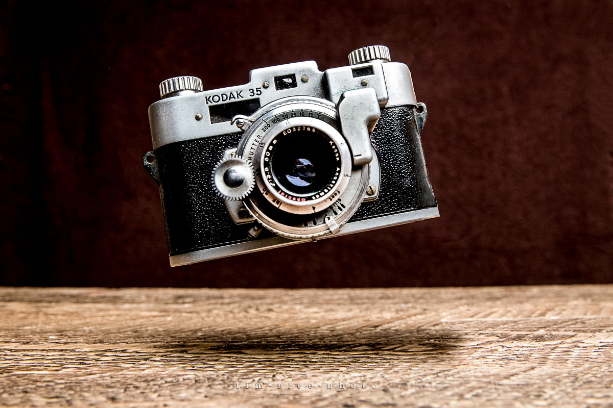 I have seen a variety of floating objects in photos for years, and recently I ran across one that had a camera floating and thought it was pretty cool looking. Now I am unpacking the studio. I have built some shelves to house my camera collection, pushing fifty on display with more to be found and added. So why not start a series of camera photos since I have easy access to them for the first time in decades. This one is a 1940’s Kodak 35 Range Finder, one of the first 35mm cameras Kodak manufactured in the states.