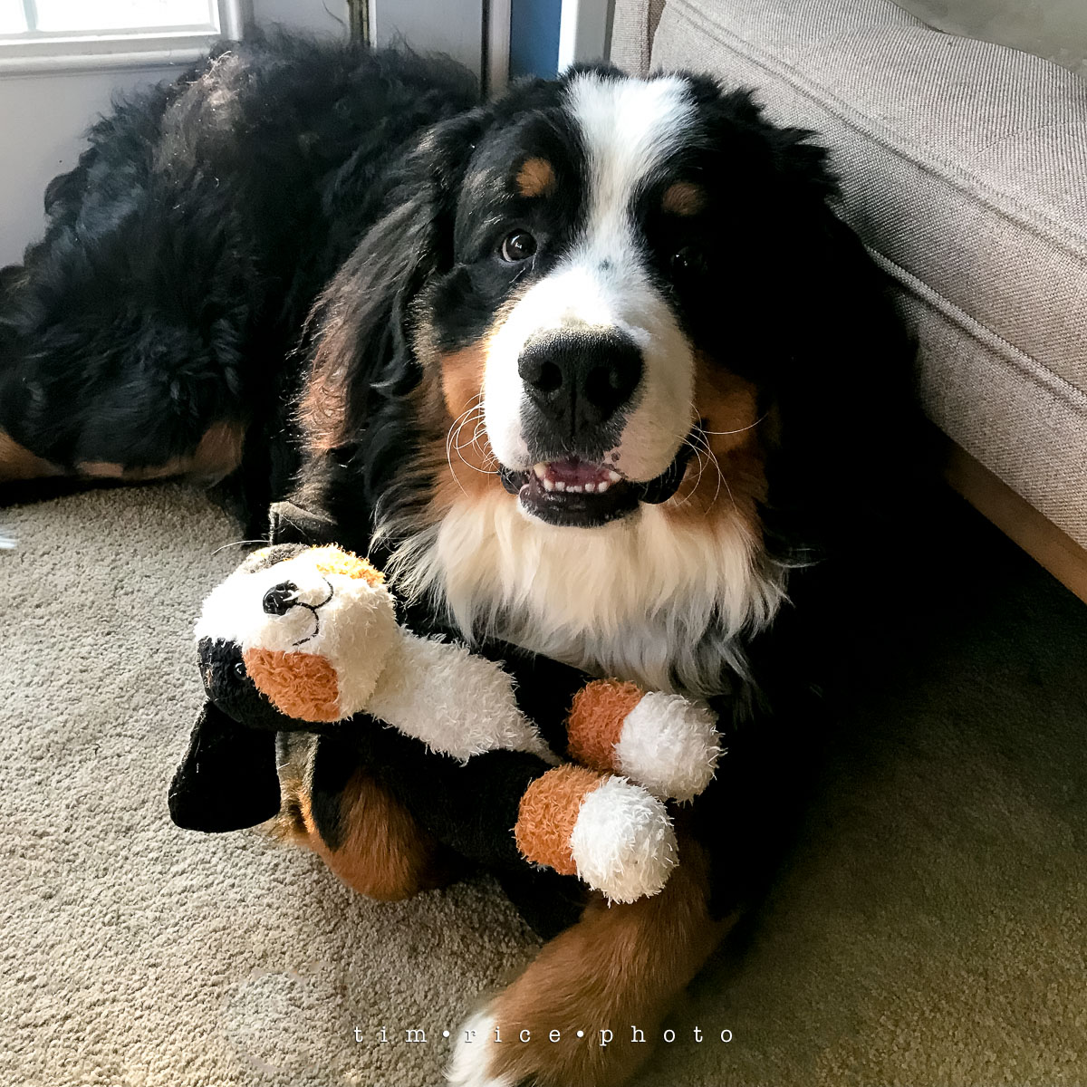 The stuffed Berner has been here for three years; we used it to tell the kids Josie was joining the family, then in photos with the dogs, Argus found it sitting on a shelf when no one was looking it and stole it. I would have thought it would have been the end of the stuffed one, but turns out Argus just wanted to cuddle. Tune in tomorrow for Argus’s first birthday post.