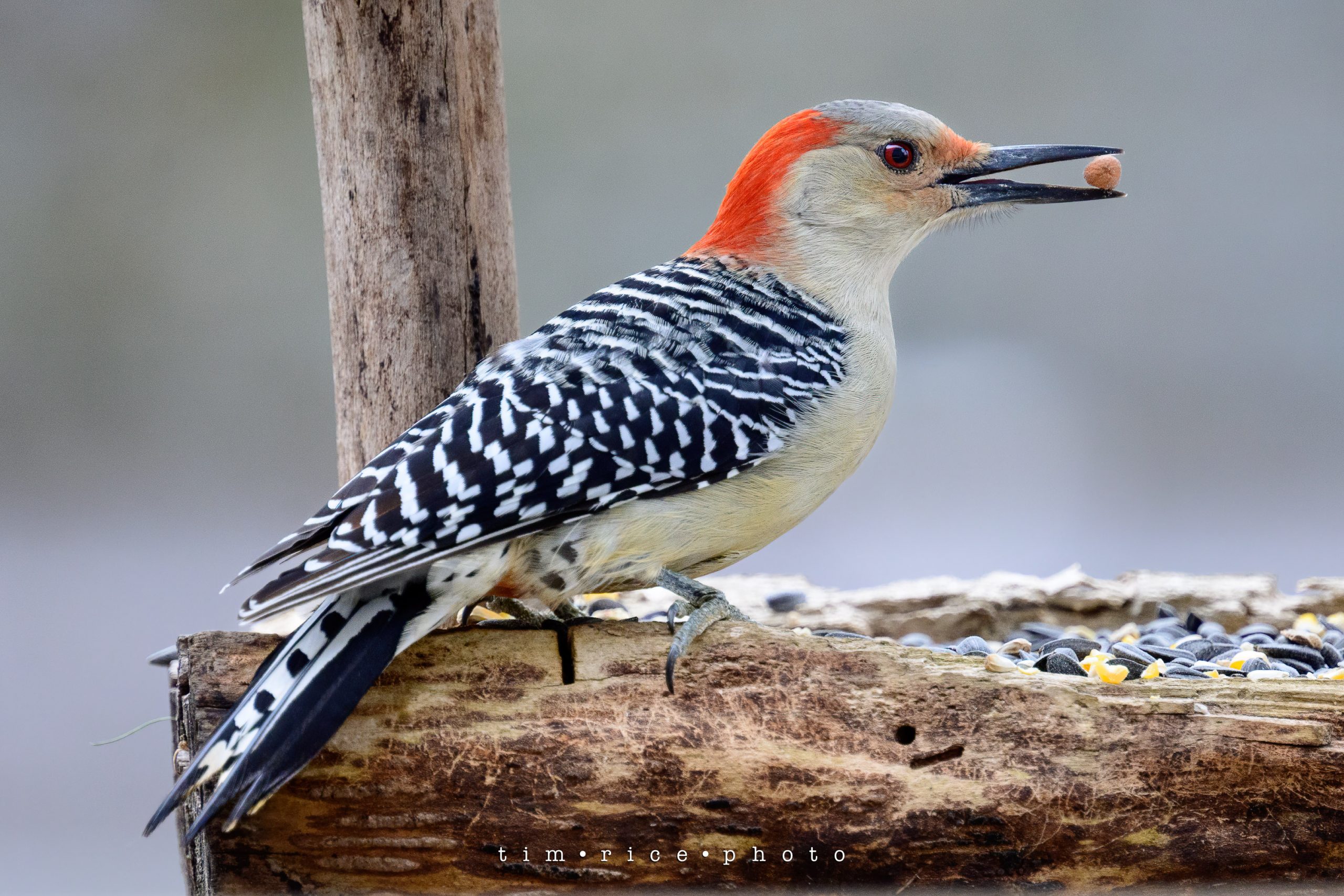 Today’s feeder friend is the Red-Bellied Woodpecker. Though it is more like a redhead, or red-eyed, not so much red-belly. Hung around quite a while.