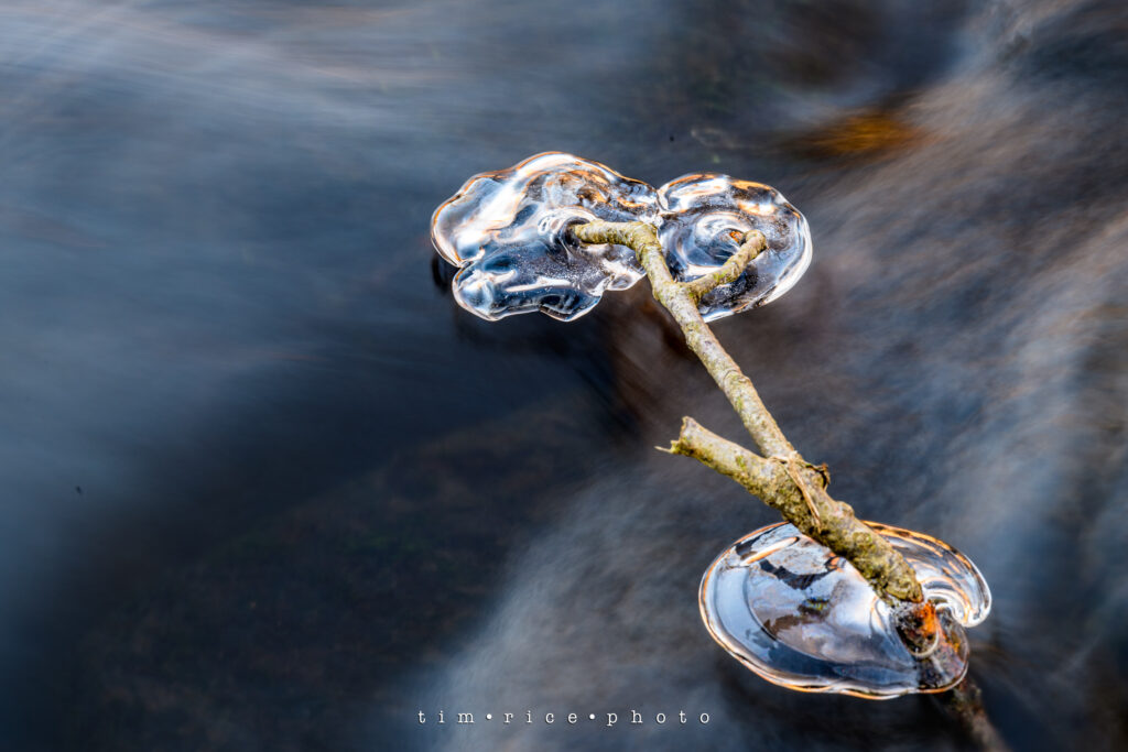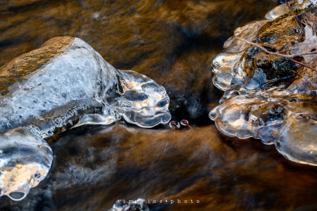 As the sun set, I played with the light and water at the local stream. All taken with a tripod, about a one-second exposure to get the water rush, and gloves – I was cold.