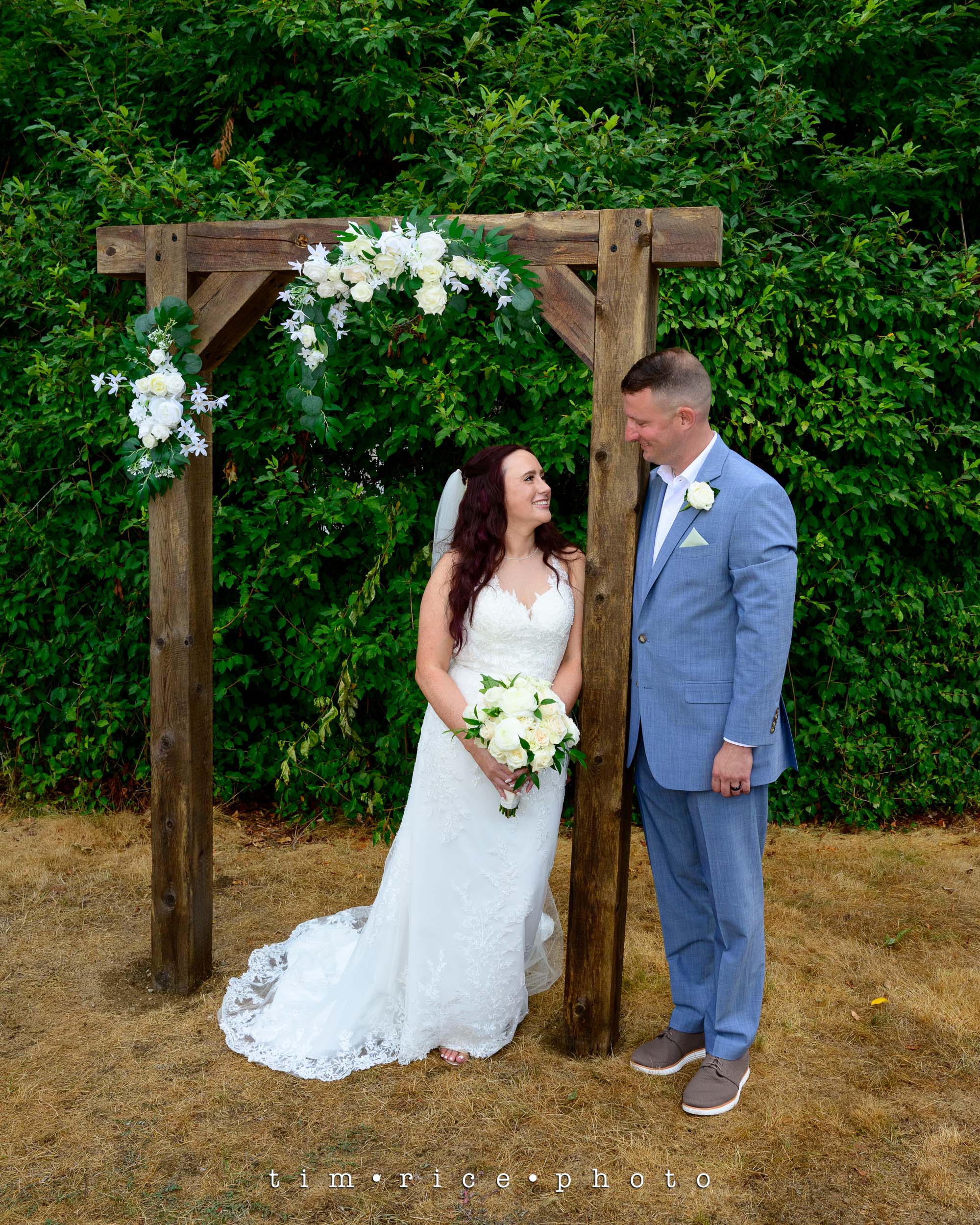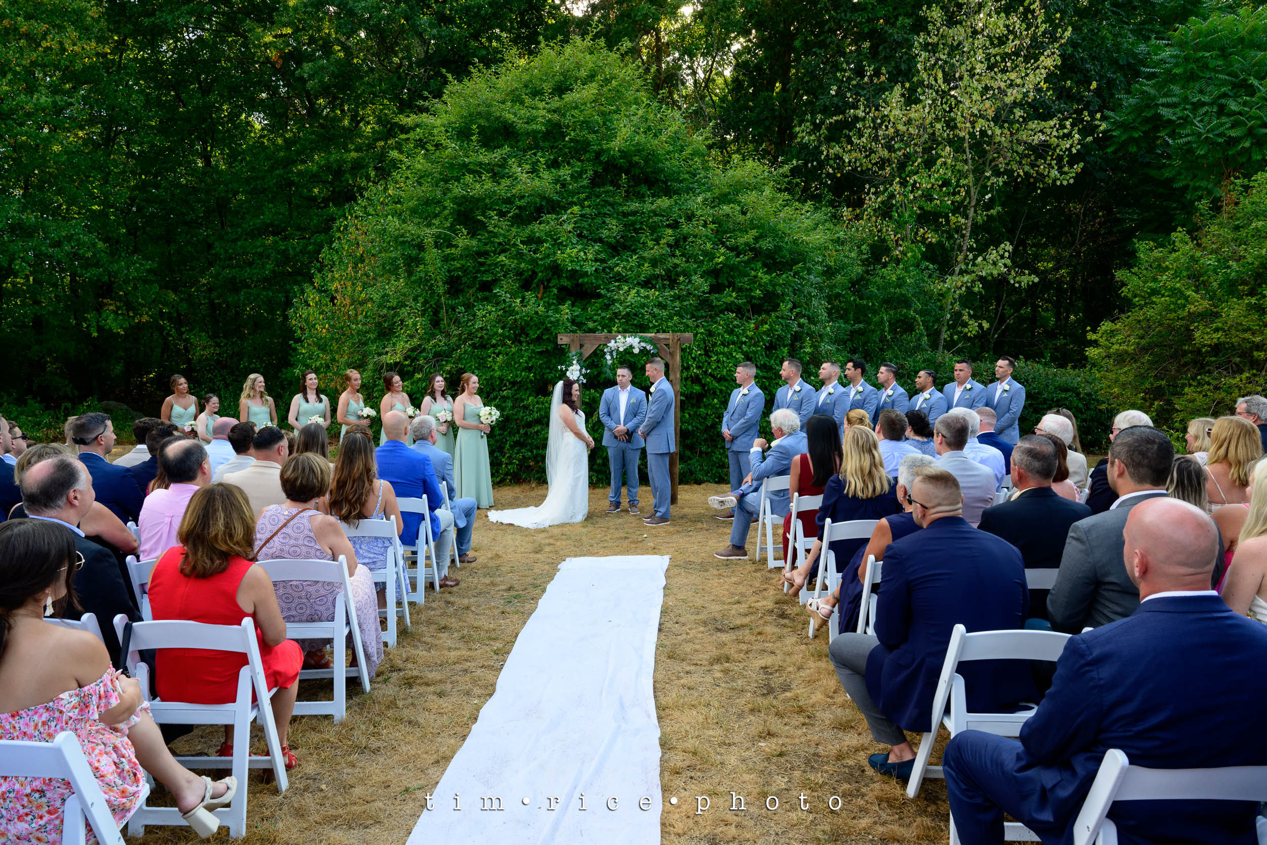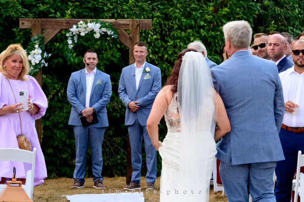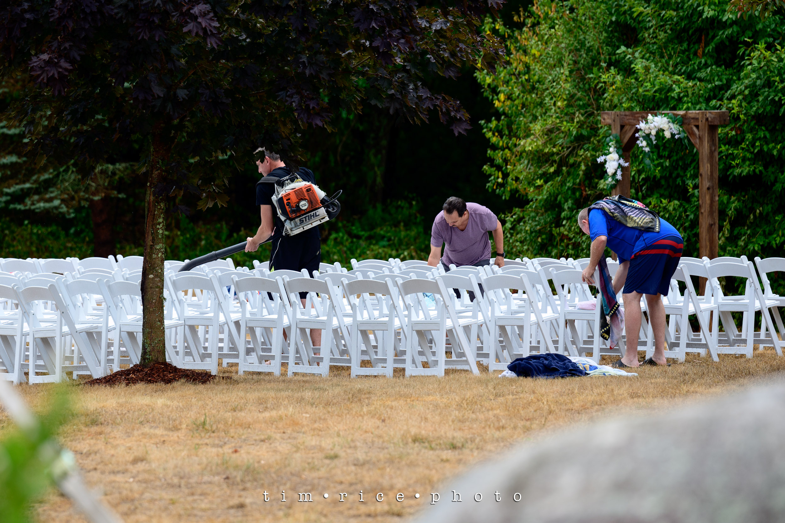 Starudta’s wedding did not start the way one would plan. After three months of no rain in the area, we got three months of rain… in 20 minutes. I stepped onto the driveway to get into the truck and make the 5-minute drive to the Bride’s Family Home cameras ready. Then lighting cracked, and then it just poured. That word is not strong enough. There was wind, streams of water, and hail. I was soaked before I made it to the truck, and I never saw it coming. The 5-minute drive was 15 minutes long. Roads were flooded, and visibility was gone. I made it, and the outside wedding set up in the front yard was drenched. Fortunately, the tents were still intact, but people were everywhere trying to grab things flying off the tables, covering anything they could. We got the bridal party in the house with umbrellas, and the rain was gone in less than 20 minutes. The neighbors came out and helped clean off chairs, leaf blowers, and beach towels to the rescue and reset the whole thing. It was a sight to watch. Within the hour, everyone was seated, the sun was out, and the ceremony was beautiful. Collen and Bruce’s day was perfect, and it was an honor to be part of this special day, nothing was going to stop it, especially with family and friends like they have. Congratulations!