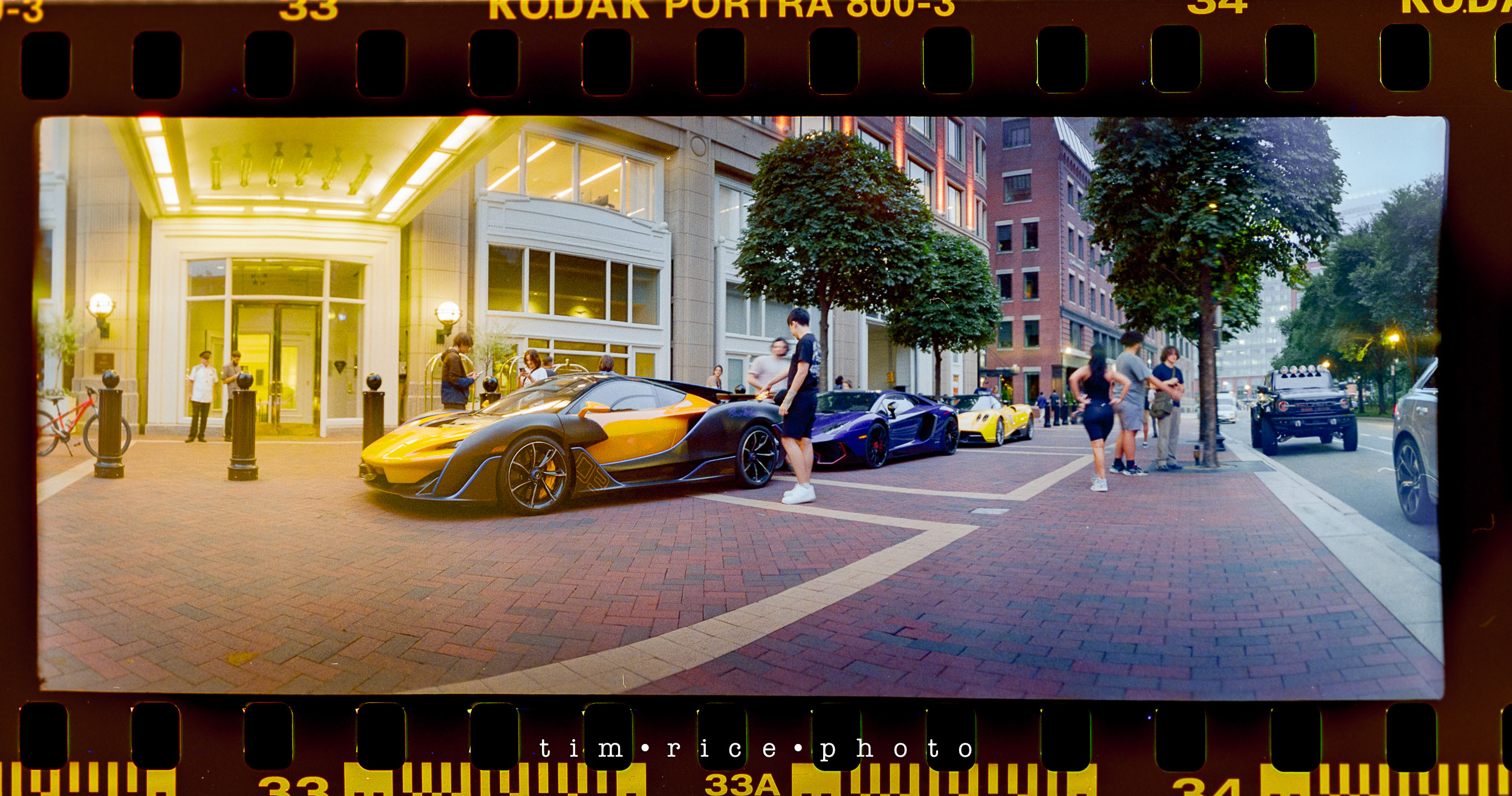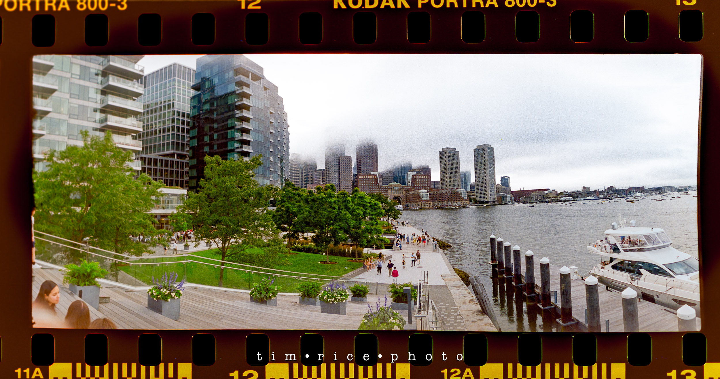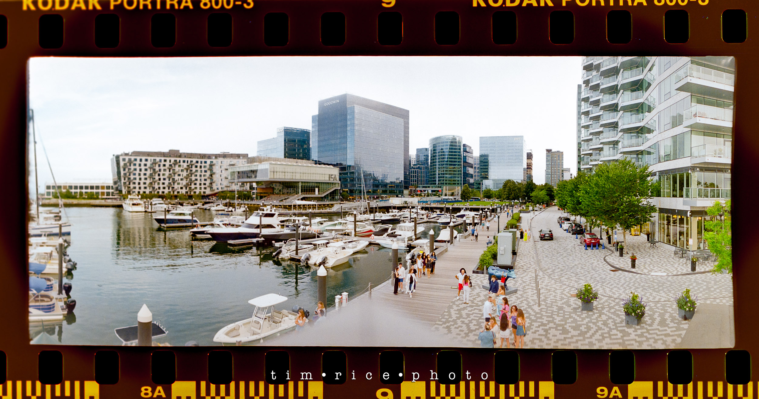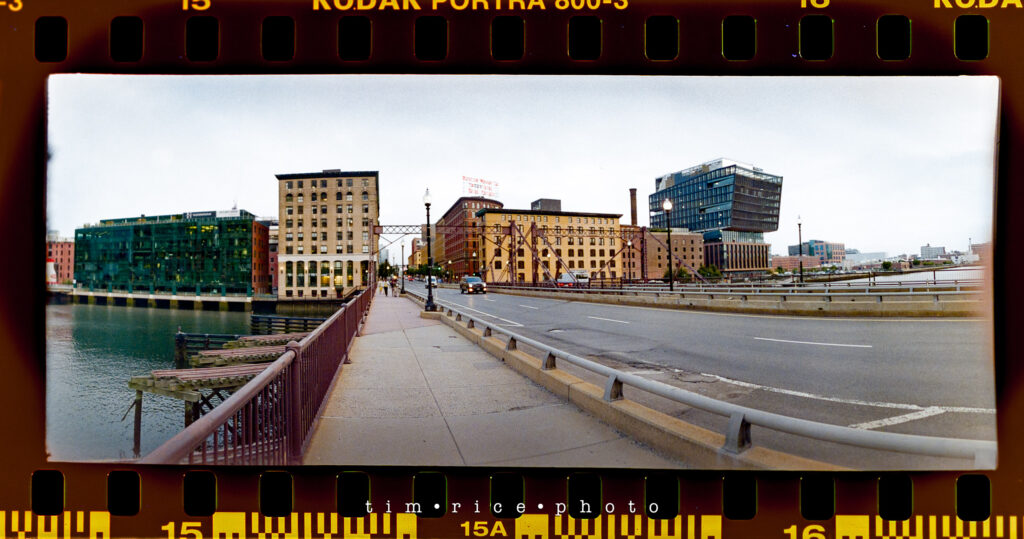 I shot a roll of film in Boston, along the water near Fan Pier and Atlantic Ave. I took the Widelux and the Hasselblad with me for the walk. The Hasselblad was not loaded correctly. No one to blame but me. Stupid mistake (that will only happen once), so all I have is the Widelux images. Sad because I really liked some of the shots I would have had with the Hasselblad – it means I need another walk. These panoramic images are a great consolation price, though. The best part of the walk was in front of the Boston Harbor Hotel. There were some sports cars on display. People were taking photos and posing with them. As far as I could tell, a few young men in their 20s were offering to take pics using their nice cameras. One of them saw me take a photo (the one with the cars below) and dashed over to me which made me feel old.