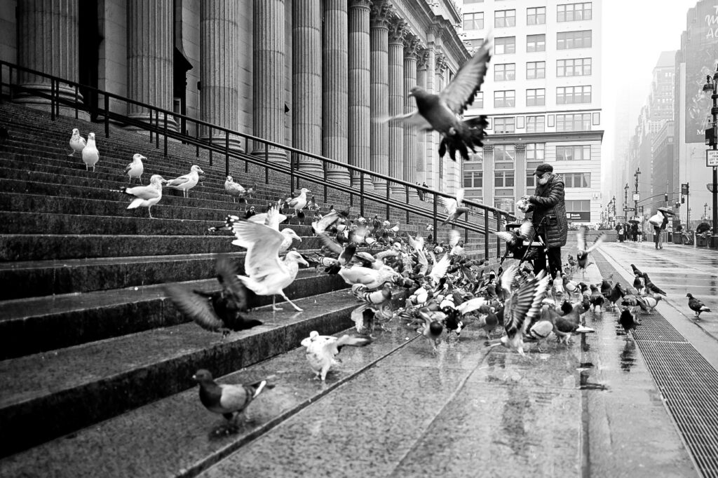 A morning solo walk to B&H Photo had me pass this scene at the New York City Post Office. The pouring rain did not bother the pigeons or the feeder.