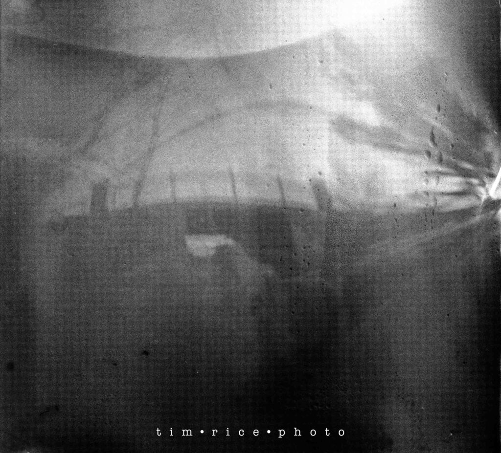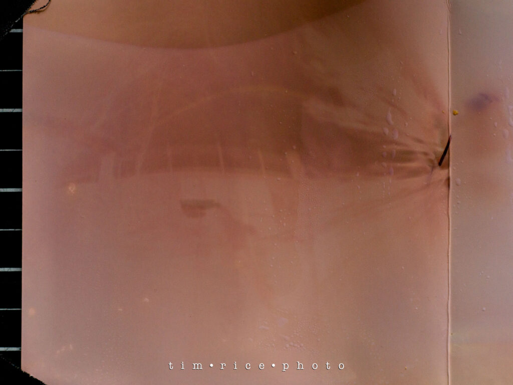 Lately, I’ve been playing around with a homemade pinhole camera made from a Starry can. Simple setup—one can with the top removed, another as a cover. A 5×5-inch piece of light-sensitive photographic paper gets placed inside in complete darkness. Tape over the pinhole, set it where I want, and let time do its thing.