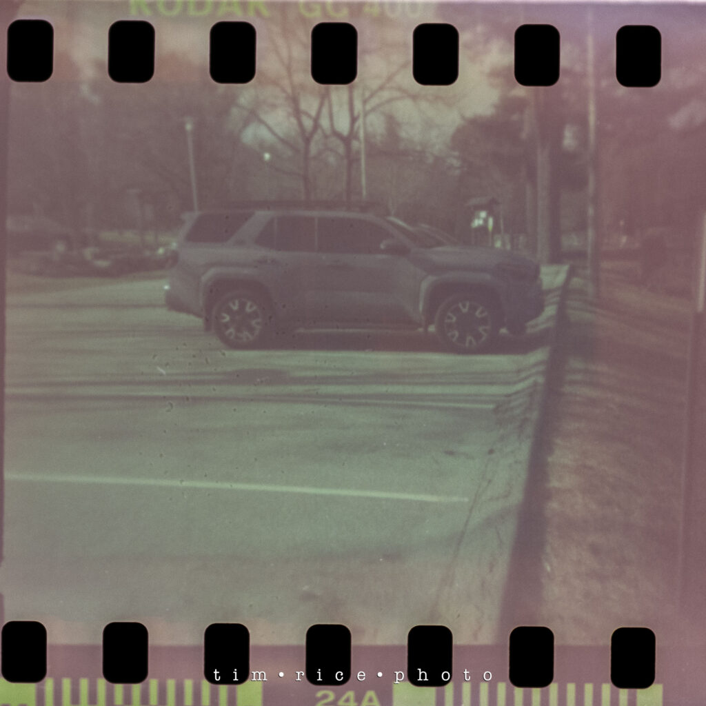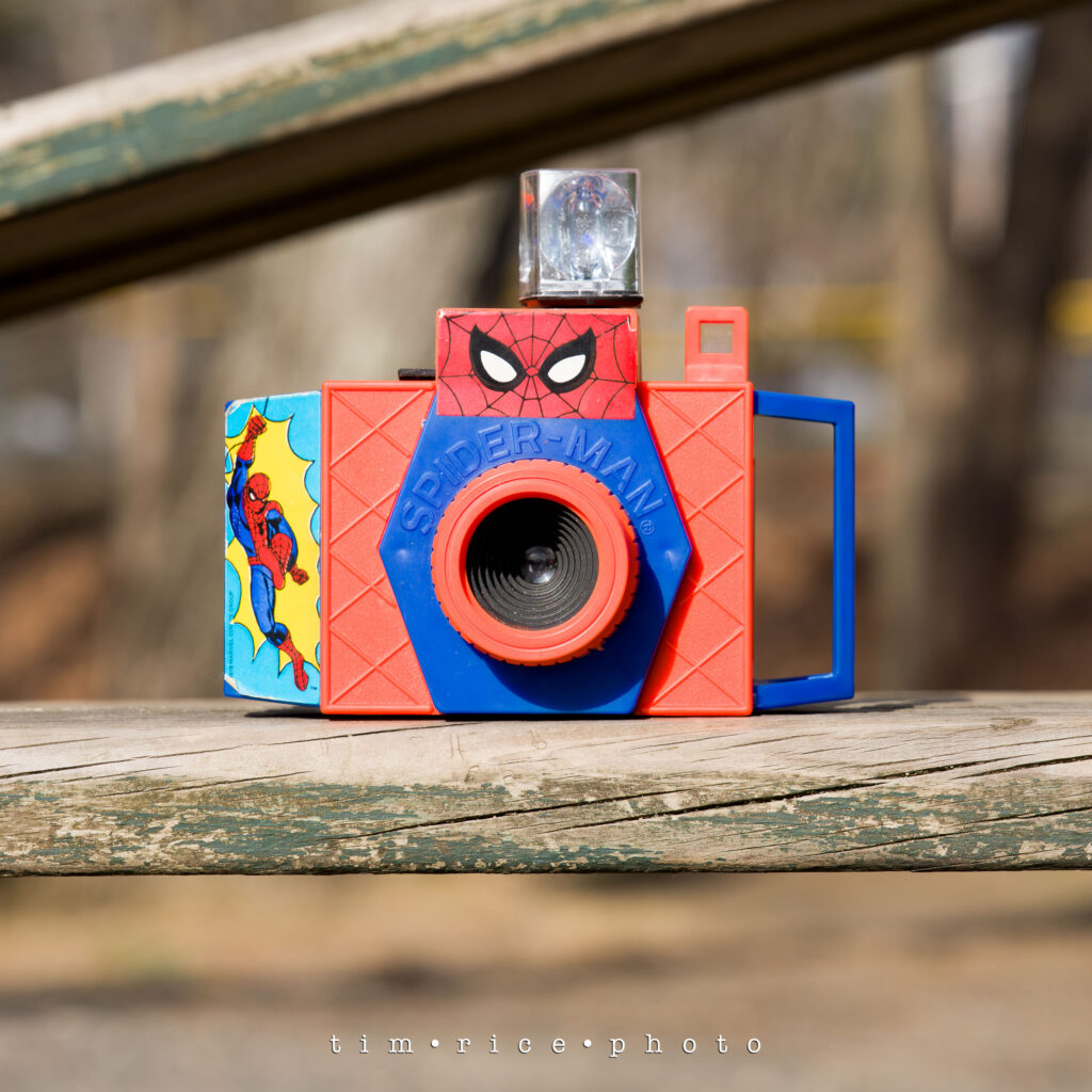 First up was a favorite, my 1977 Spider-Man 126 camera. Still boxed. A glorified toy. The film it is designed for is no longer made, and was discontinued long before the film faded. I found a company selling 3D-printed cartridges shaped like 126mm film that I can load with 35mm film. Due to the lens opening, it takes the whole emulsion from top to bottom, so you get an image that bleeds over the sprockets. I love the look.