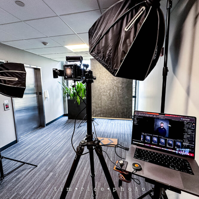 Today’s studio is set up for headshots. A few dozen employees came together for a company meeting, using the time