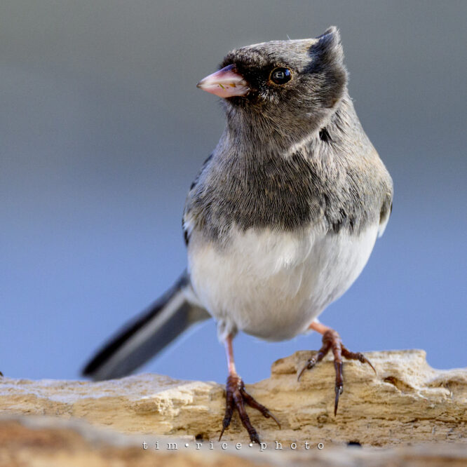 The wind-blown look of a dark-eyed Junco. Posing at the feeder for me. tr/trp