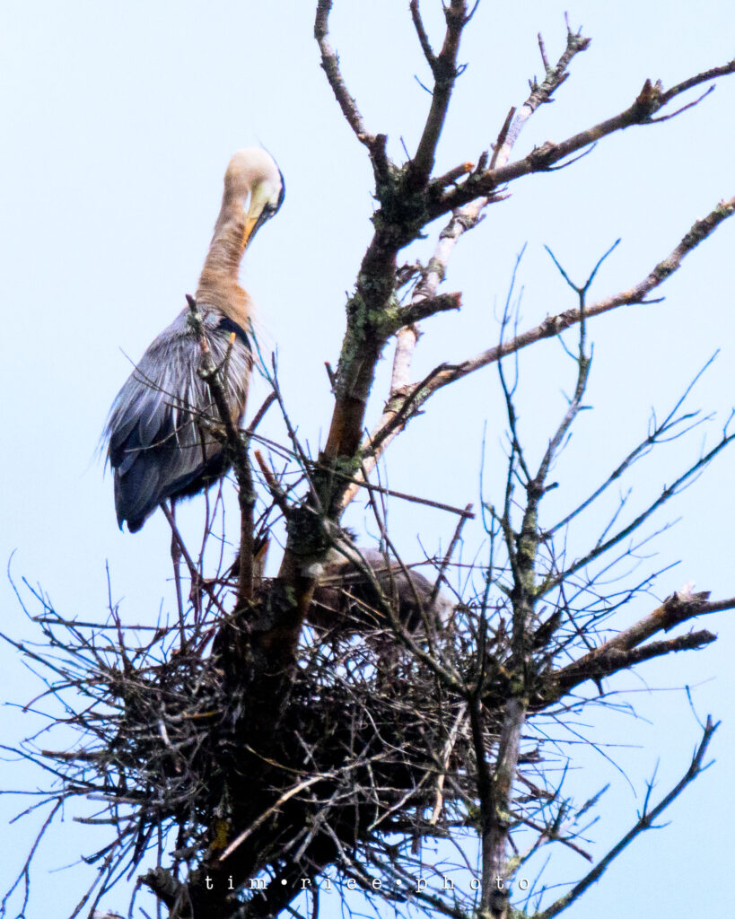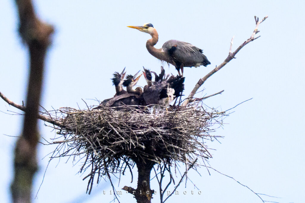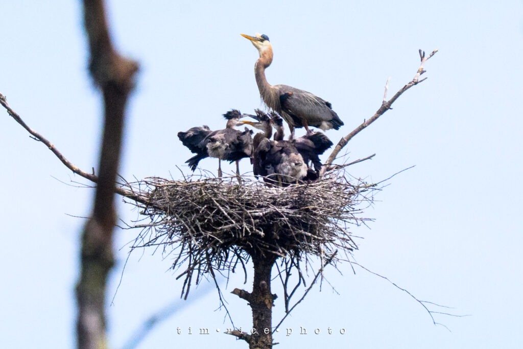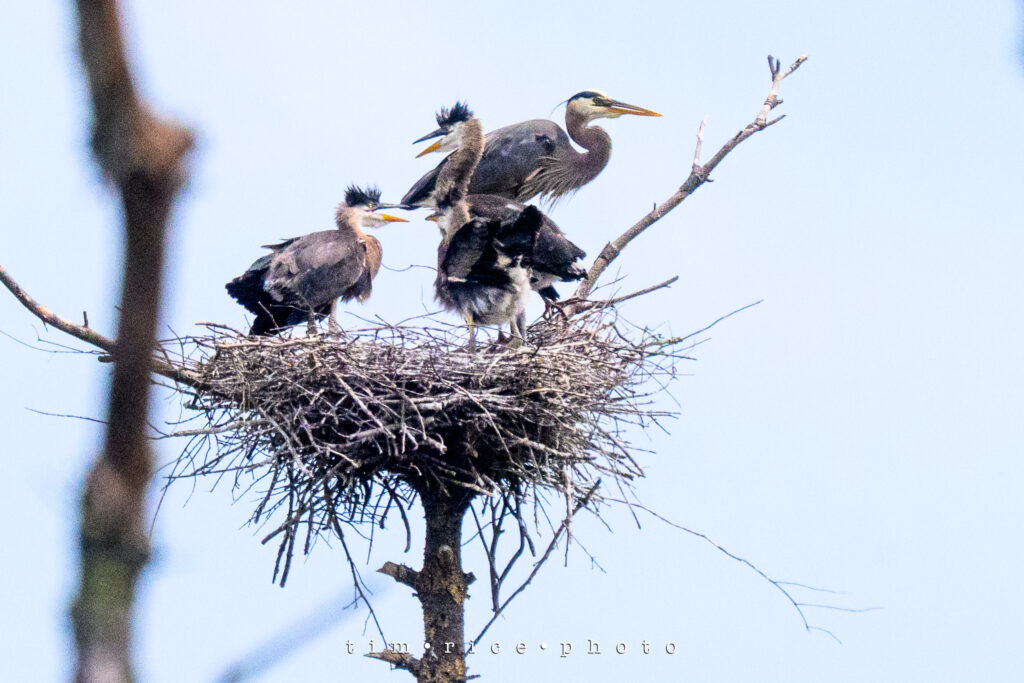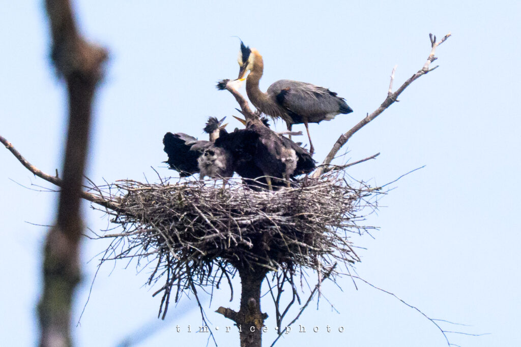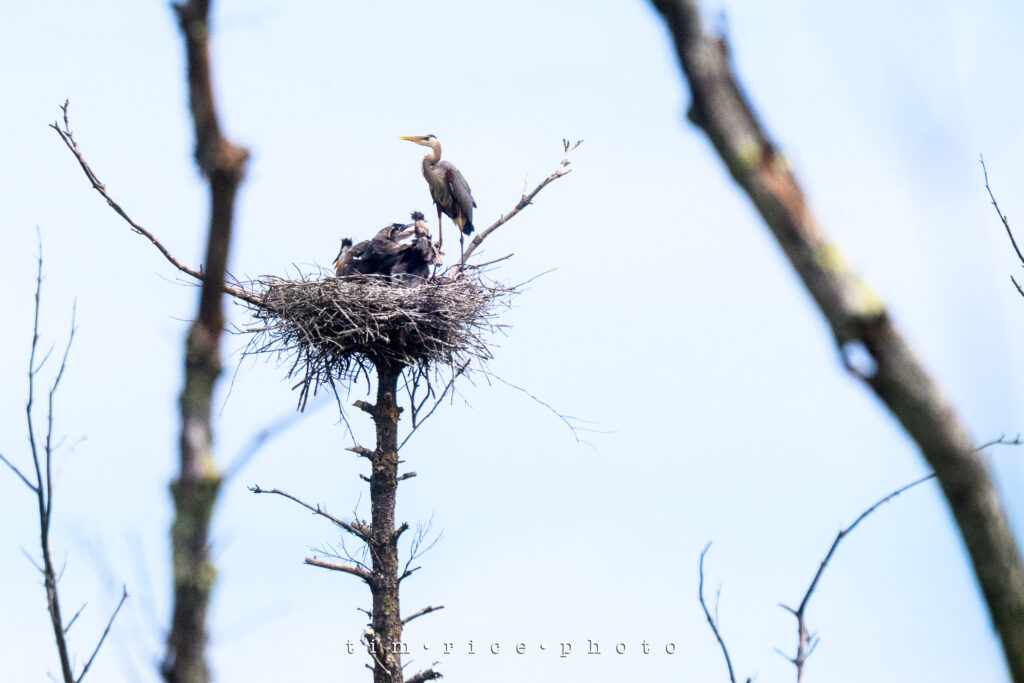 I was given a heads-up a few weeks ago about the location of Heron nests. Just far enough off the road that they are challenging to photograph, but a blast to watch. I have stopped a few times and seen the little ones grow. Today, I hung out for a bit, tried to take some photos, but nothing worth sharing. As I packed up the camera, a Heron closer to the road got my attention as it took off from the swamp. Then I followed it to its nest. The second they landed, the little ones perked up, and it was feeding time. Tough crops to make them visible, but still an incredible scene.
