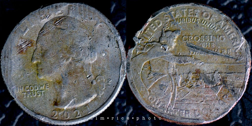As the machine clinked away, it kicked this quarter back. Just a glance, and I figured it was old — it’s beat to hell. But nope. 2021. Without missing a beat, Dan said, “That’s exactly what something from 2021 should look like.”